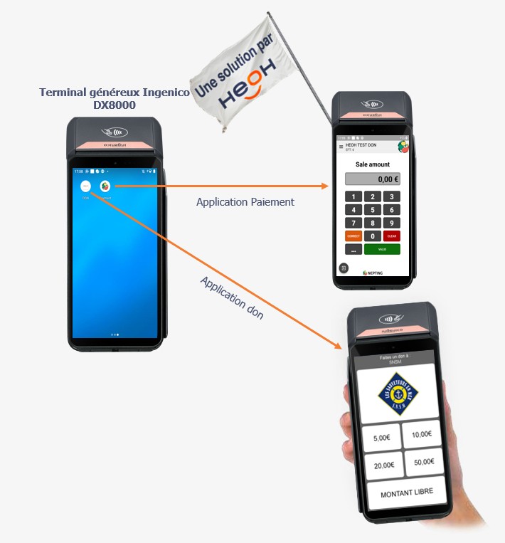 Le terminal généreux offre la possibilité de payer en sans contact, ou avec contrôle du code. Ce terminal peut créditer plusieurs comptes différents.